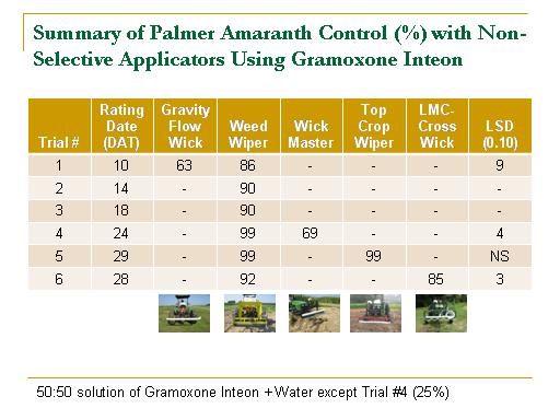 Summary of Palmer Amaranth Control (%) with Non-Selective Applicators Using Gramoxone Inteon<BR>50:50 solution of Gramoxone Inteon + Water except Trial #4 (25%)<BR>