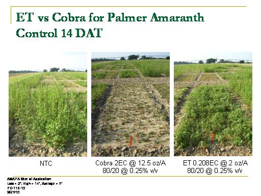 ET vs Cobra for Palmer Amaranth Control 14 DAT<BR>NTC<BR>Cobra 2EC @ 12.5 oz/A <BR>80/20 @ 0.25% v/v<BR>ET 0.208EC @ 2 oz/A <BR>80/20 @ 0.25% v/v<BR>AMAPA Size at Application <BR>Low = 2”; High = 14”, Average = 7” <BR>PE-11B-10 <BR>9/21/10<BR>