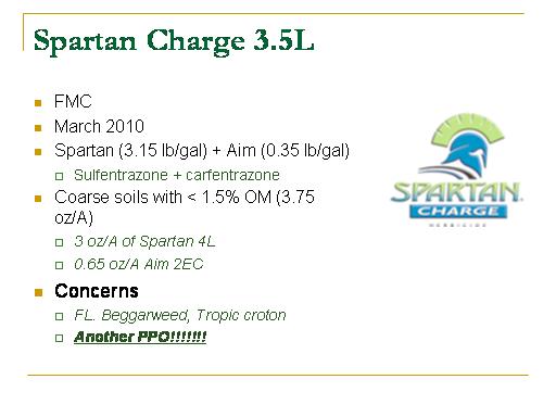 Spartan Charge 3.5L<BR>FMC <BR>March 2010 <BR>Spartan (3.15 lb/gal) + Aim (0.35 lb/gal) <BR>Sulfentrazone + carfentrazone <BR>Coarse soils with < 1.5% OM (3.75 oz/A) <BR>3 oz/A of Spartan 4L <BR>0.65 oz/A Aim 2EC <BR>Concerns <BR>FL. Beggarweed, Tropic croton <BR>Another PPO!!!!!!!<BR>