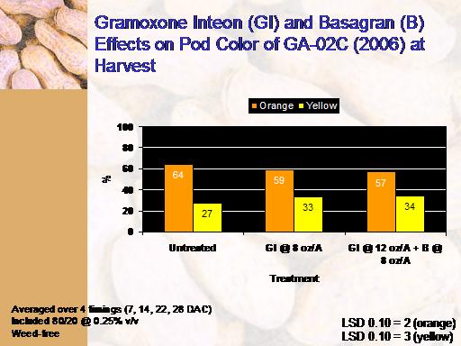 Gramoxone Inteon (GI) and Basagran (B) Effects on Pod Color of GA-02C (2006) at Harvest<BR>Averaged over 4 timings (7, 14, 22, 28 DAC) <BR>Included 80/20 @ 0.25% v/v <BR>Weed-free<BR>LSD 0.10 = 2 (orange) <BR>LSD 0.10 = 3 (yellow)<BR>