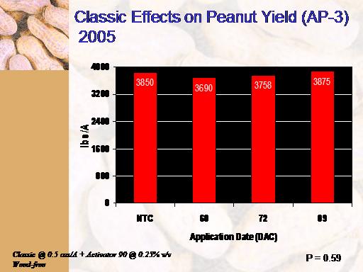 Classic Effects on Peanut Yield (AP-3)  2005<BR>P = 0.59<BR>Classic @ 0.5 ozs/A + Activator 90 @ 0.25% v/v <BR>Weed-free<BR>