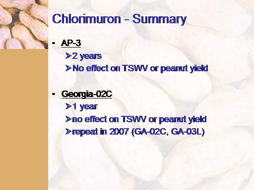 Chlorimuron - Summary<BR>AP-3 <BR>2 years <BR>No effect on TSWV or peanut yield <BR> <BR>Georgia-02C <BR>1 year <BR>no effect on TSWV or peanut yield <BR>repeat in 2007 (GA-02C, GA-03L)<BR>