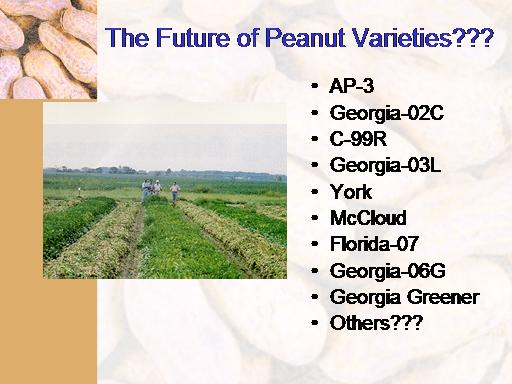 The Future of Peanut Varieties???<BR>AP-3 <BR>Georgia-02C <BR>C-99R <BR>Georgia-03L <BR>York <BR>McCloud <BR>Florida-07 <BR>Georgia-06G <BR>Georgia Greener <BR>Others???<BR>