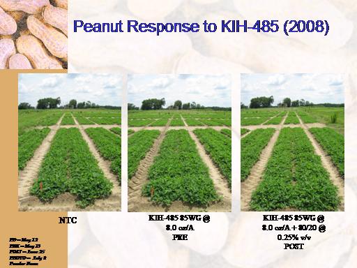 Peanut Response to KIH-485 (2008)<BR>NTC<BR>KIH-485 85WG @ <BR>8.0 oz/A <BR>PRE<BR>KIH-485 85WG @ <BR>8.0 oz/A + 80/20 @ 0.25% v/v <BR>POST<BR>PD = May 12 <BR>PRE = May 13 <BR>POST = June 25 <BR>PHOTO =  July 8 <BR>Ponder Farm<BR>