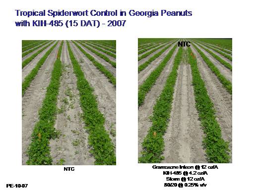 Tropical Spiderwort Control in Georgia Peanuts  with KIH-485 (15 DAT) - 2007<BR>NTC<BR>Gramoxone Inteon @ 12 oz/A <BR>KIH-485 @ 4.2 oz/A <BR>Storm @ 12 oz/A <BR>80/20 @ 0.25% v/v <BR>PE-10-07<BR>NTC<BR>