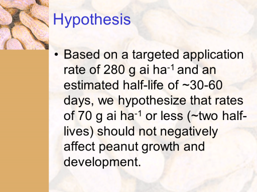 Hypothesis<BR>Based on a targeted application rate of 280 g ai ha-1 and an estimated half-life of ~30-60 days, we hypothesize that rates of 70 g ai ha-1 or less (~two half-lives) should not negatively affect peanut growth and development.<BR>