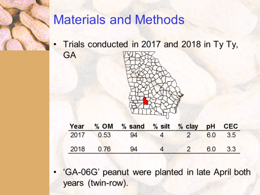 Materials and Methods<BR>Trials conducted in 2017 and 2018 in Ty Ty, GA <BR> <BR> <BR> <BR> <BR> <BR> <BR> <BR> <BR>‘GA-06G’ peanut were planted in late April both years (twin-row). <BR>