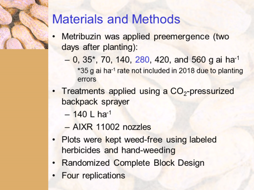 Materials and Methods<BR>Metribuzin was applied preemergence (two days after planting): <BR>0, 35*, 70, 140, 280, 420, and 560 g ai ha-1 <BR>*35 g ai ha-1 rate not included in 2018 due to planting errors <BR>Treatments applied using a CO2-pressurized backpack sprayer <BR>140 L ha-1 <BR>AIXR 11002 nozzles <BR>Plots were kept weed-free using labeled herbicides and hand-weeding <BR>Randomized Complete Block Design <BR>Four replications<BR>