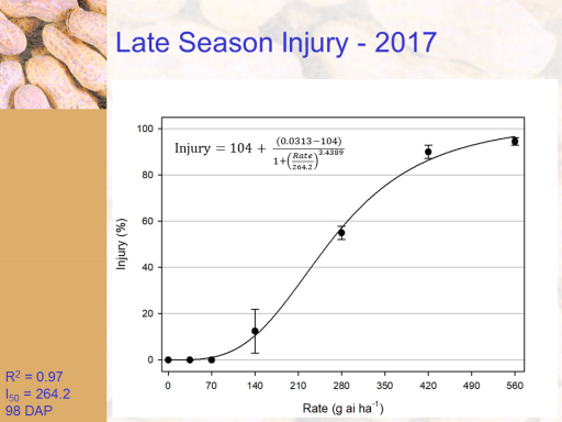 Late Season Injury - 2017<BR>R2 = 0.97 <BR>I50 = 264.2 <BR>98 DAP<BR>