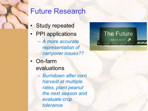 Future Research<BR>Study repeated <BR>PPI applications <BR>A more accurate representation of carryover issues?? <BR>On-farm evaluations <BR>Burndown after corn harvest at multiple rates, plant peanut the next season and evaluate crop tolerance<BR>