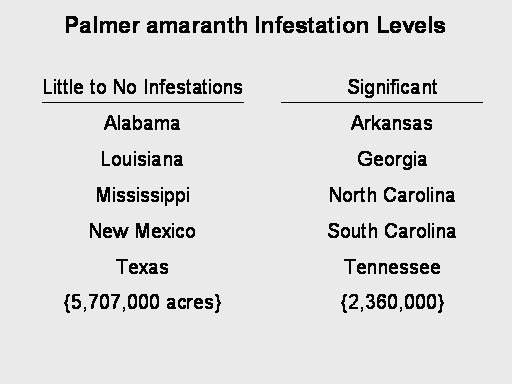 Significant <BR>Arkansas <BR>Georgia <BR>North Carolina <BR>South Carolina <BR>Tennessee <BR>{2,360,000}<BR>Palmer amaranth Infestation Levels<BR>Little to No Infestations <BR>Alabama <BR>Louisiana <BR>Mississippi <BR>New Mexico <BR>Texas <BR>{5,707,000 acres}<BR>