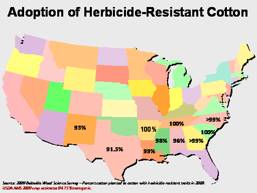 Adoption of Herbicide-Resistant Cotton<BR>>99%<BR>Source: 2009 Beltwide Weed Science Survey – Percent cotton planted to cotton with herbicide-resistant traits in 2009. <BR>USDA AMS 2009 crop estimates 94.75% transgenic.<BR>>99%<BR>100%<BR>96%<BR>100%<BR>100%<BR>99%<BR>98%<BR>91.5%<BR>93%<BR>