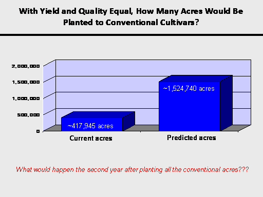 With Yield and Quality Equal, How Many Acres Would Be Planted to Conventional Cultivars?<BR>Current acres<BR>What would happen the second year after planting all the conventional acres???<BR>~417,945 acres<BR>Predicted acres<BR>~1,524,740 acres<BR>