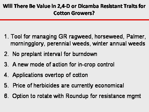 Will There Be Value in 2,4-D or Dicamba Resistant Traits for Cotton Growers?<BR>1. Tool for managing GR ragweed, horseweed, Palmer,        	morningglory, perennial weeds, winter annual weeds <BR>2.  No preplant interval for burndown <BR>3.  A new mode of action for in-crop control <BR>4.  Applications overtop of cotton <BR>5.  Price of herbicides are currently economical <BR>6.  Option to rotate with Roundup for resistance mgmt <BR>