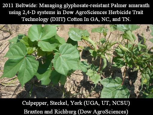 2011 Beltwide: Managing glyphosate-resistant Palmer amaranth using 2,4-D systems in Dow AgroSciences Herbicide Trait Technology (DHT) Cotton In GA, NC, and TN. <BR>Culpepper, Steckel, York (UGA, UT, NCSU)  <BR>Braxton and Richburg (Dow AgroSciences)<BR>