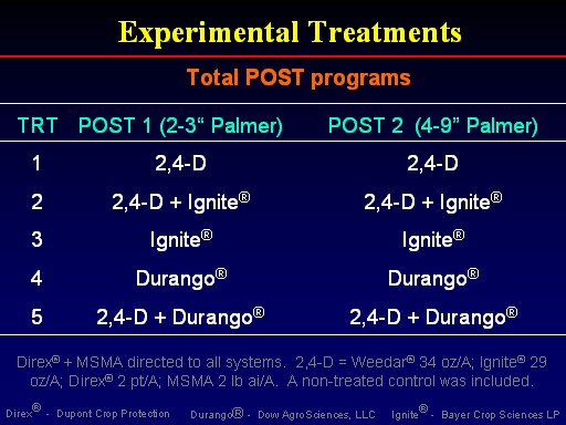 Experimental Treatments <BR>   <BR>POST 1 (2-3“ Palmer)  <BR>2,4-D <BR>2,4-D + Ignite® <BR>Ignite® <BR>Durango® <BR>2,4-D + Durango®<BR>POST 2  (4-9” Palmer) <BR>2,4-D  <BR>2,4-D + Ignite® <BR>Ignite® <BR>Durango® <BR>2,4-D + Durango®<BR>Total POST programs<BR>Direx® + MSMA directed to all systems.  2,4-D = Weedar® 34 oz/A; Ignite® 29 oz/A; Direx® 2 pt/A; MSMA 2 lb ai/A.  A non-treated control was included.<BR>TRT  <BR>1 <BR>2 <BR>3 <BR>4 <BR>5<BR>Durango® -  Dow AgroSciences, LLC<BR>Direx® -  Dupont Crop Protection<BR>Ignite® -  Bayer Crop Sciences LP<BR>