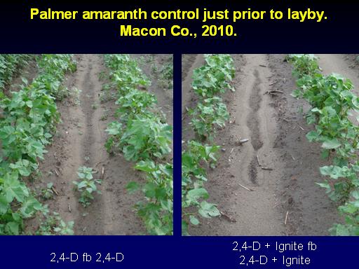 2,4-D fb 2,4-D<BR>2,4-D + Ignite fb 2,4-D + Ignite<BR>Palmer amaranth control just prior to layby.  Macon Co., 2010.<BR>