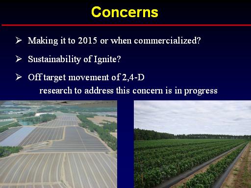 Concerns <BR> <BR>  Making it to 2015 or when commercialized? <BR> <BR>  Sustainability of Ignite? <BR> <BR>  Off target movement of 2,4-D <BR>     research to address this concern is in progress <BR>