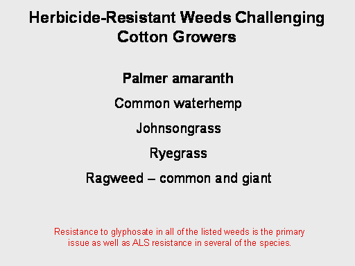 Palmer amaranth <BR>Common waterhemp <BR>Johnsongrass <BR>Ryegrass <BR>Ragweed – common and giant<BR>Herbicide-Resistant Weeds Challenging Cotton Growers<BR>Resistance to glyphosate in all of the listed weeds is the primary issue as well as ALS resistance in several of the species.<BR>