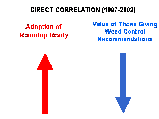 Adoption of Roundup Ready<BR>Value of Those Giving Weed Control Recommendations<BR>DIRECT CORRELATION (1997-2002)<BR>
