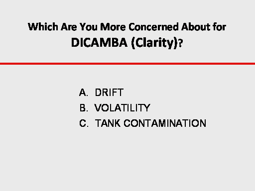 Which Are You More Concerned About for  DICAMBA (Clarity)?<BR>  DRIFT <BR>  VOLATILITY <BR>C.  TANK CONTAMINATION<BR>