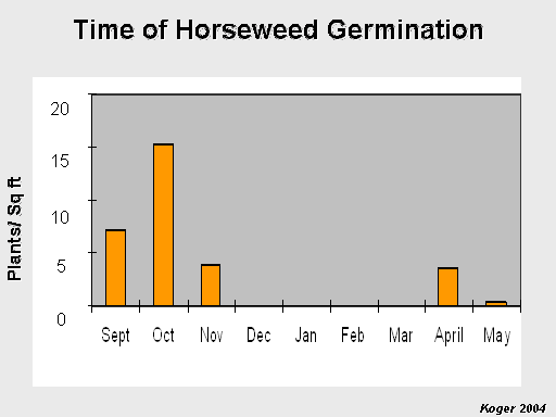 Time of Horseweed Germination<BR>Plants/ Sq ft<BR>5<BR>10<BR>15<BR>0<BR>20<BR>Koger 2004<BR>