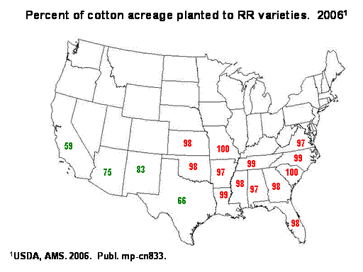 100<BR>66<BR>97<BR>99<BR>98<BR>98<BR>98<BR>99<BR>99<BR>100<BR>98<BR>98<BR>83<BR>97<BR>75<BR>97<BR>59<BR>Percent of cotton acreage planted to RR varieties.  20061<BR>1USDA, AMS. 2006.  Publ. mp-cn833.<BR>