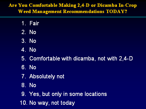 Are You Comfortable Making 2,4-D or Dicamba In-Crop Weed Management Recommendations TODAY?<BR> 1.  Fair <BR> 2.  No <BR> 3.  No <BR> 4.  No <BR> 5.  Comfortable with dicamba, not with 2,4-D <BR> 6.  No <BR> 7.  Absolutely not <BR> 8.  No <BR> 9.  Yes, but only in some locations <BR>10. No way, not today<BR>