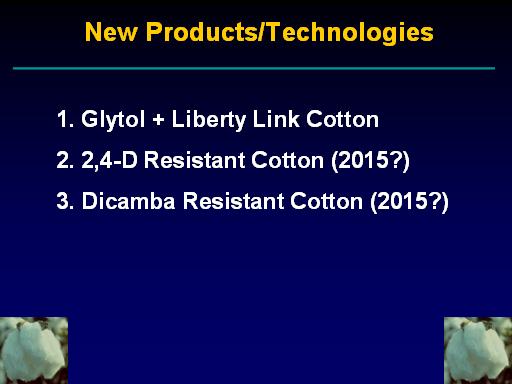 New Products/Technologies <BR> Glytol + Liberty Link Cotton <BR> 2,4-D Resistant Cotton (2015?) <BR> Dicamba Resistant Cotton (2015?)<BR>