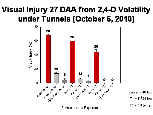 Visual Injury 27 DAA from 2,4-D Volatility under Tunnels (October 6, 2010)<BR>20<BR>20<BR>20<BR>19<BR>13<BR>0<BR>0<BR>4<BR>6<BR>Entire  = 48 hrs<BR>T1 = 1st 24 hrs<BR>T2 = 2nd 24 hrs<BR>