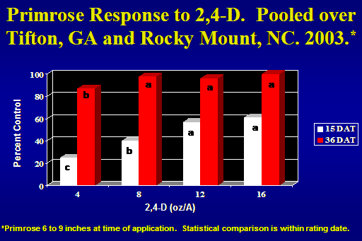 Primrose Response to 2,4-D.  Pooled over Tifton, GA and Rocky Mount, NC. 2003.*<BR>*Primrose 6 to 9 inches at time of application.  Statistical comparison is within rating date.<BR>