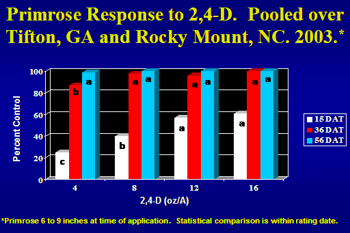 Primrose Response to 2,4-D.  Pooled over Tifton, GA and Rocky Mount, NC. 2003.*<BR>*Primrose 6 to 9 inches at time of application.  Statistical comparison is within rating date.<BR>