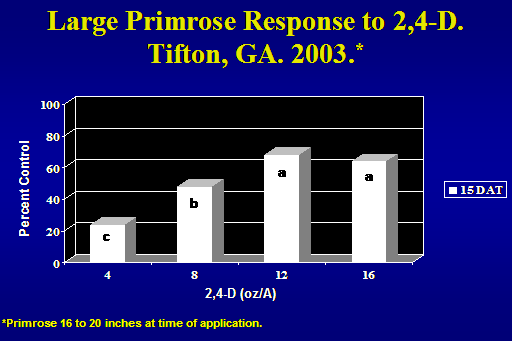 Large Primrose Response to 2,4-D. Tifton, GA. 2003.*<BR>*Primrose 16 to 20 inches at time of application.  <BR>
