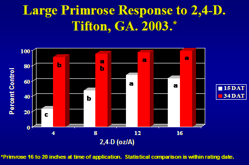 Large Primrose Response to 2,4-D. Tifton, GA. 2003.*<BR>*Primrose 16 to 20 inches at time of application.  Statistical comparison is within rating date.<BR>
