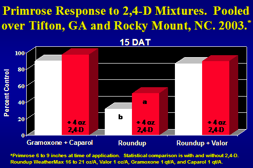 Primrose Response to 2,4-D Mixtures.  Pooled over Tifton, GA and Rocky Mount, NC. 2003.*<BR>*Primrose 6 to 9 inches at time of application.  Statistical comparison is with and without 2,4-D.  Roundup WeatherMax 16 to 21 oz/A, Valor 1 oz/A, Gramoxone 1 qt/A, and Caparol 1 qt/A.<BR>