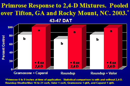 Primrose Response to 2,4-D Mixtures.  Pooled over Tifton, GA and Rocky Mount, NC. 2003.*<BR>*Primrose 6 to 9 inches at time of application.  Statistical comparison is with and without 2,4-D.  Roundup WeatherMax 16 to 21 oz/A, Valor 1 oz/A, Gramoxone 1 qt/A, and Caparol 1 qt/A.<BR>