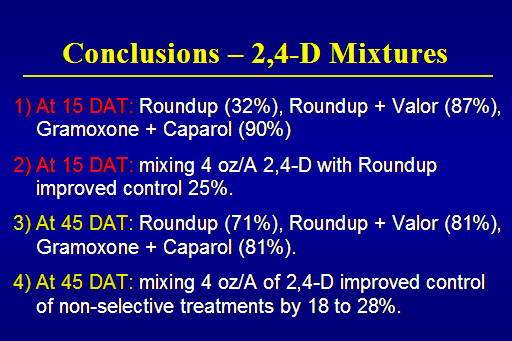Conclusions – 2,4-D Mixtures<BR>At 15 DAT: Roundup (32%), Roundup + Valor (87%), Gramoxone + Caparol (90%)