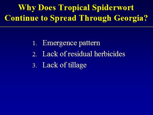 Why Does Tropical Spiderwort Continue to Spread Through Georgia?<BR>Emergence pattern <BR>Lack of residual herbicides <BR>Lack of tillage <BR>