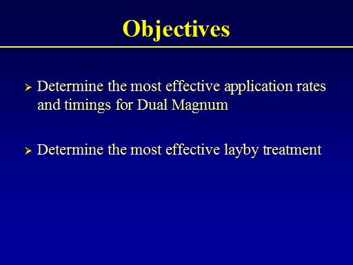 Objectives<BR>Determine the most effective application rates and timings for Dual Magnum <BR> <BR>Determine the most effective layby treatment <BR>  <BR>
