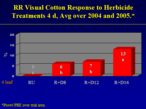 RR Visual Cotton Response to Herbicide Treatments 4 d, Avg over 2004 and 2005.*<BR>*Prowl PRE over trial area.<BR>