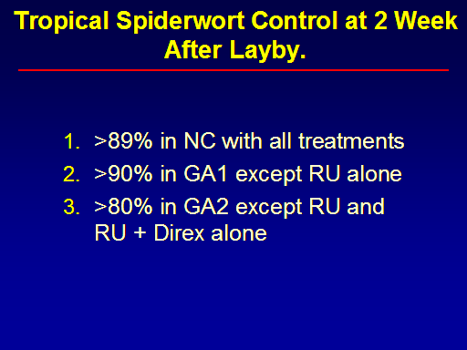 Tropical Spiderwort Control at 2 Week After Layby.  <BR>>89% in NC with all treatments
