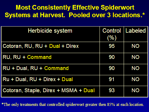 Most Consistently Effective Spiderwort Systems at Harvest.  Pooled over 3 locations.*<BR>*The only treatments that controlled spiderwort greater then 85% at each location.<BR>