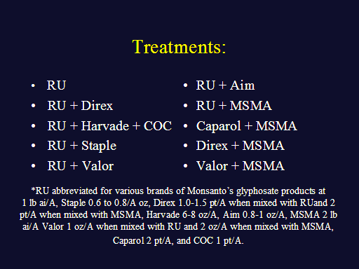 <BR>1 lb ai/A, Staple 0.6 to 0.8/A oz, Direx 1.0-1.5 pt/A when mixed with RUand 2 pt/A when mixed with MSMA, Harvade 6-8 oz/A, Aim 0.8-1 oz/A, MSMA 2 lb ai/A Valor 1 oz/A when mixed with RU and 2 oz/A when mixed with MSMA, Caparol 2 pt/A, and COC 1 pt/A. <BR>