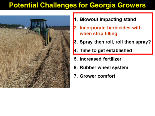 Potential Challenges for Georgia Growers<BR>Blowout impacting stand <BR>Incorporate herbicides with when strip tilling <BR>Spray then roll, roll then spray? <BR>Time to get established <BR>Increased fertilizer <BR>Rubber wheel system <BR>Grower comfort<BR>