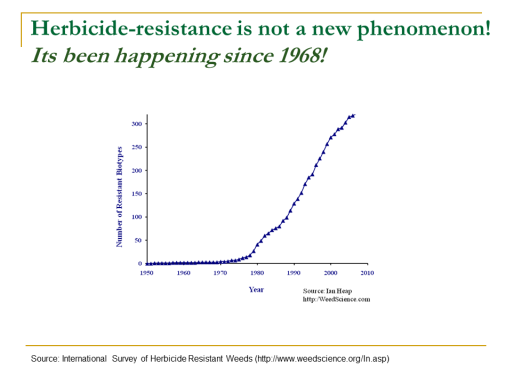 Herbicide-resistance is not a new phenomenon! Its been happening since 1968!<BR>Source: International Survey of Herbicide Resistant Weeds (http://www.weedscience.org/In.asp)<BR>