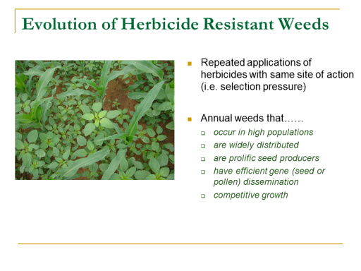 Evolution of Herbicide Resistant Weeds<BR>Repeated applications of herbicides with same site of action (i.e. selection pressure) <BR> <BR>Annual weeds that…… <BR>occur in high populations <BR>are widely distributed <BR>are prolific seed producers <BR>have efficient gene (seed or pollen) dissemination <BR>competitive growth <BR>