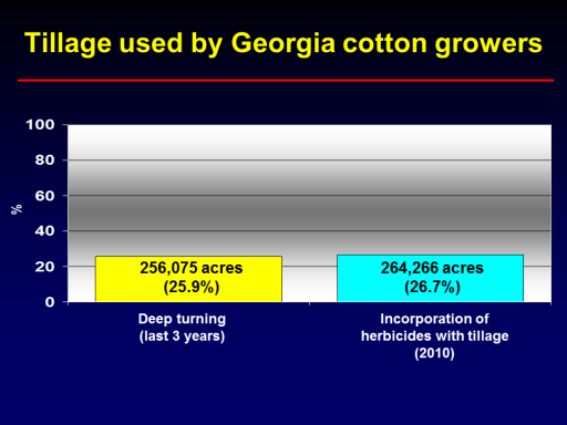 Tillage used by Georgia cotton growers<BR>256,075 acres (25.9%)<BR>264,266 acres (26.7%)<BR>Deep turning            (last 3 years)<BR>Incorporation of herbicides with tillage (2010)<BR>%<BR>