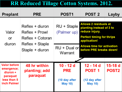 RR Reduced Tillage Cotton Systems. 2012.<BR>Allows 2 residuals at planting instead of 3 to reduce injury. <BR>Perfect timing for thrips application! <BR>Allows time for activation before PRE breaks down! <BR>