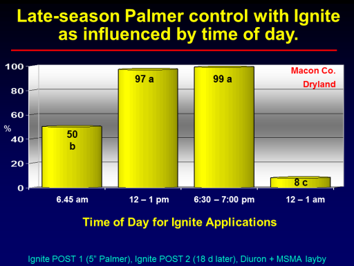 99 a<BR>50 b<BR>97 a<BR>6.45 am<BR>8 c<BR>Ignite POST 1 (5” Palmer), Ignite POST 2 (18 d later), Diuron + MSMA layby<BR>12 – 1 pm <BR>6:30 – 7:00 pm<BR>12 – 1 am<BR>Late-season Palmer control with Ignite as influenced by time of day. <BR>Time of Day for Ignite Applications<BR>Macon Co. <BR>Dryland<BR>%<BR>