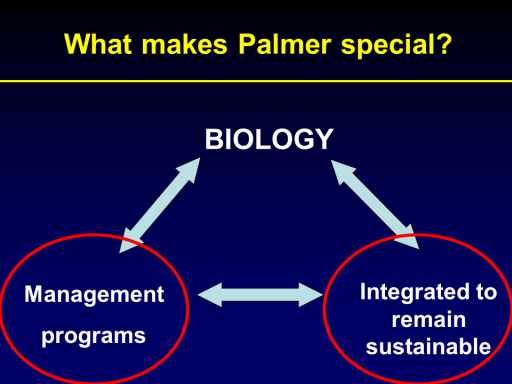 What makes Palmer special? <BR>BIOLOGY<BR>    Integrated to remain sustainable<BR>Management <BR>programs<BR>